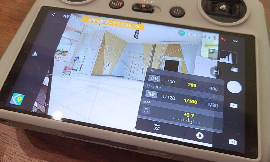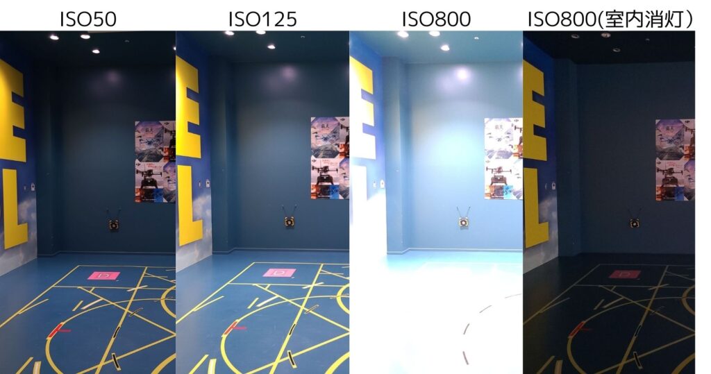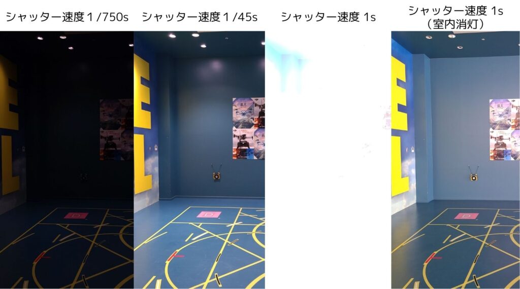なので暗い場所で撮影する際にはシャッター速度を遅くするのがオススメです。しかしシャッター速度が遅いとブレが目立ちやすいので操縦は丁寧に行いましょう。