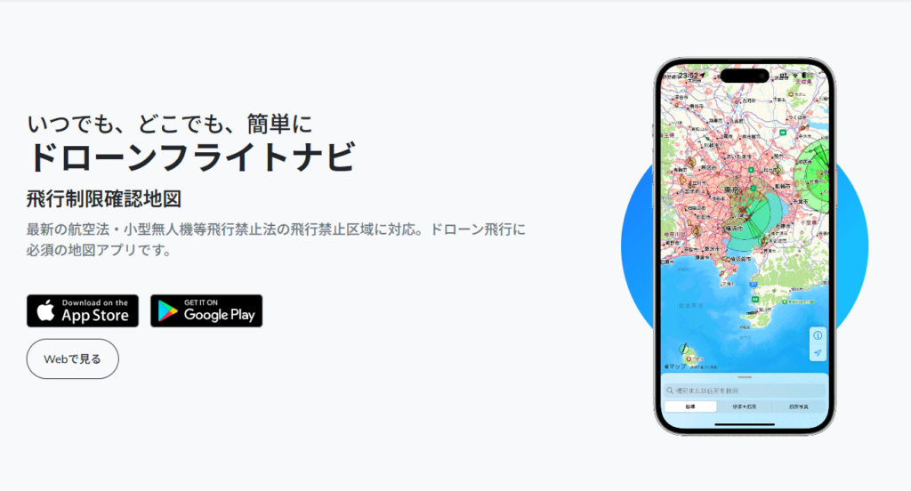ウェブサイトではドローンフライトナビや、DIPS2.0(ドローン情報基盤システム2.0)の飛行の通報を行う画面で、規制エリアを確認できるので、アプリが使えなくても問題ありません。