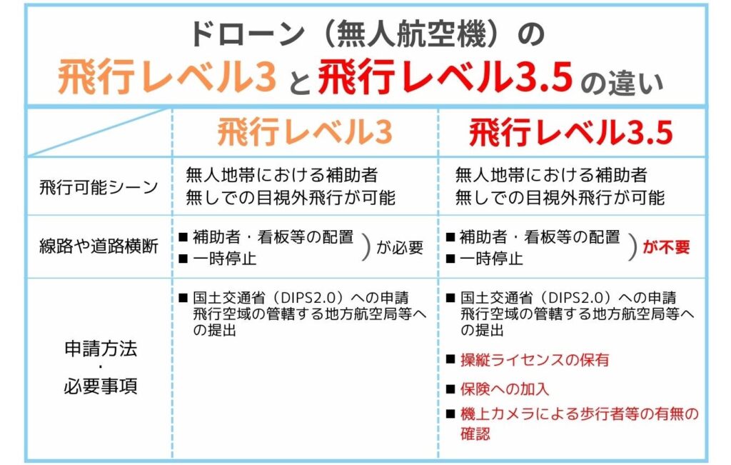 2023年12月には、レベル3飛行とレベル4飛行の中間的な位置付けの「レベル3.5飛行」が新設され、レベル3飛行を行うための飛行要件が緩和されました。