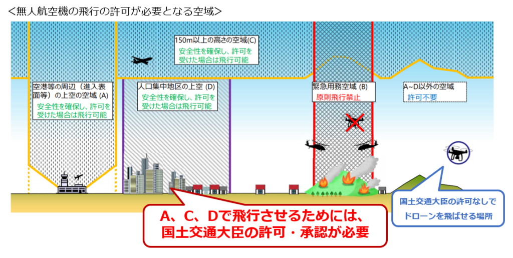 100g以上の機体に適用される法律で、航空法で規制されているエリアは緊急用務空域を除いて許可・承認を得ることで飛行可能になっております。しかし飛行方法によっては飛行リスクが高まるので許可・承認が貰いにくくなることがあります。