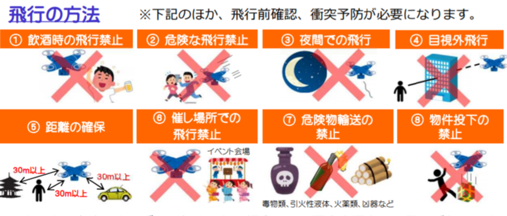 飛行方法に関する法律は航空法で定められており、それを順守する必要があります。