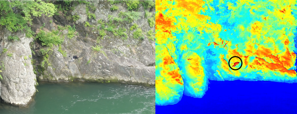 通常のカメラだと埋もれた人は確認できませんが、温度を検知する赤外線カメラであればより確実に遭難者の救助が可能です。