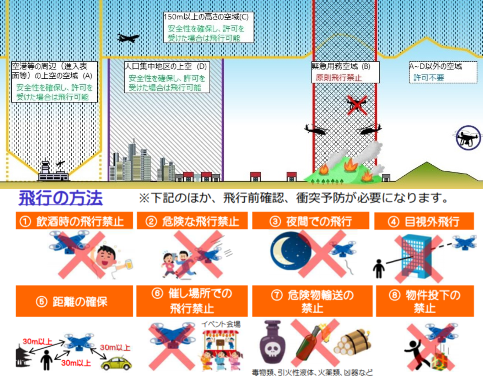 ・目視外での飛行 ・人または物件との距離を確保できない飛行 ・催し場所上空での飛行 ・危険物の輸送 ・物件の投下 |