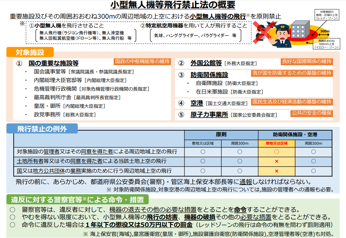 小型無人機等飛行禁止法は、重要施設やその周辺上空におけるドローンの飛行を禁止する法律です。