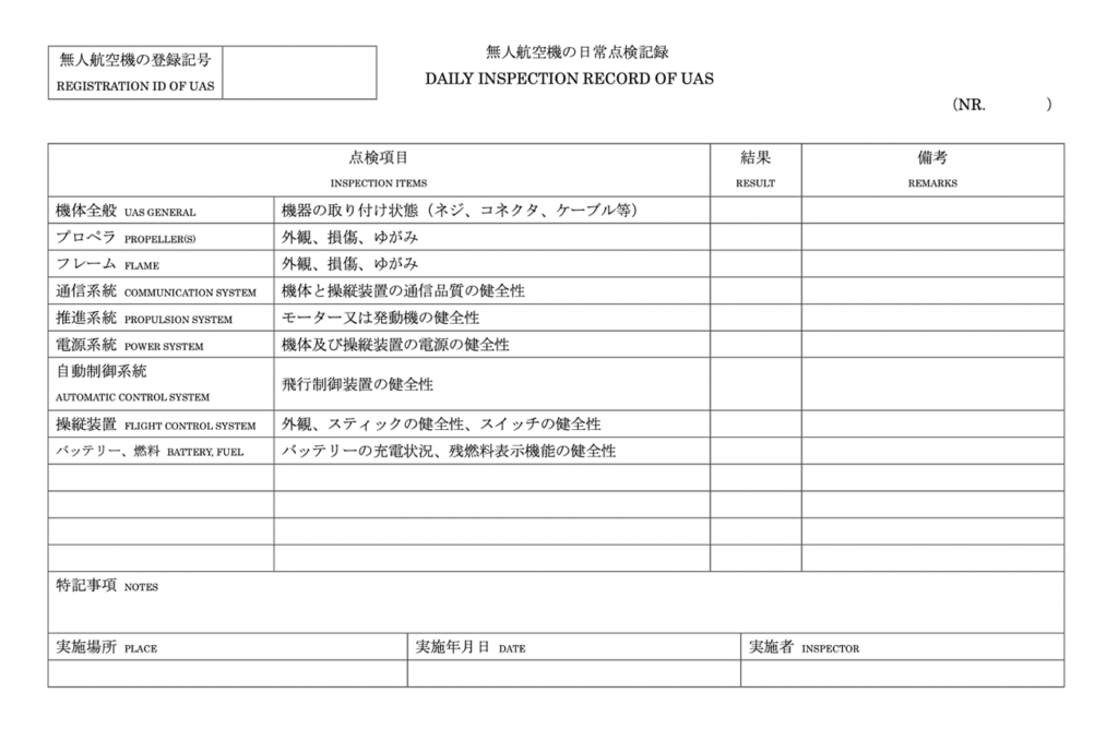 飛行日誌には、飛行ごとの内容を記録するだけでなく、定期的な点検を行った結果も記載していきます。