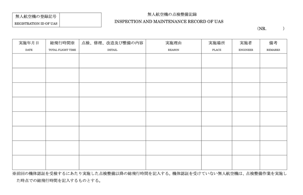 飛行場所や日時を記録するだけでなく、機体のメンテナンス情報も細かく記入する必要があります。