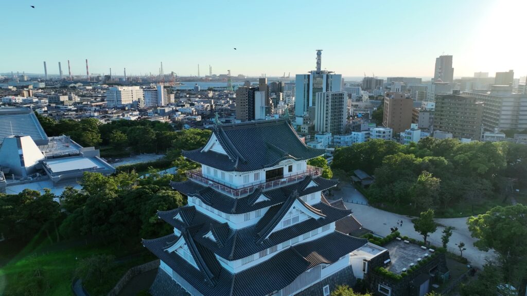 千葉市立郷土博物館のご協力のもと、千葉城を模した美しい建物をドローンで撮影することができました。都市のビル群を背景に、堂々と立つお城の姿は、伝統と現代が融合した非常に印象的な景観を生み出しています。