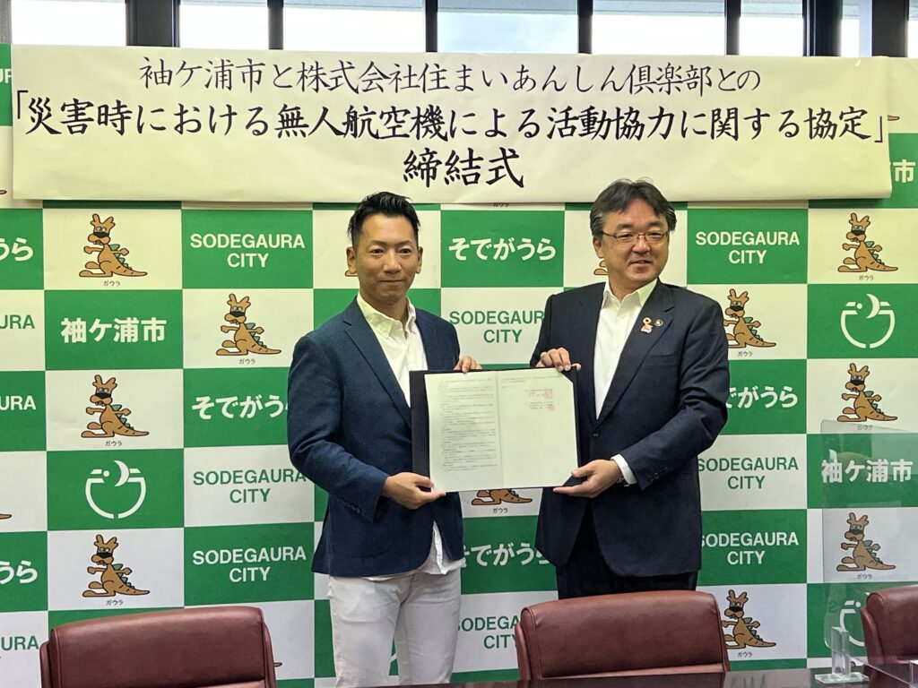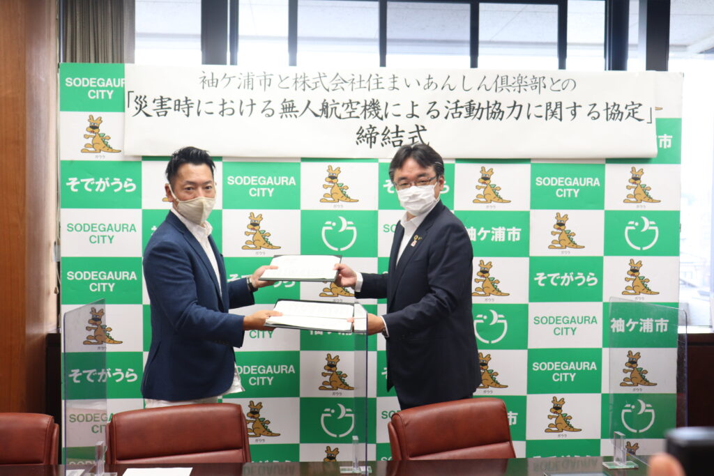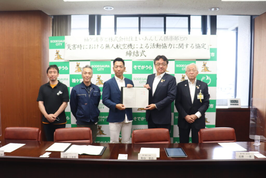 令和4年7月11日、袖ヶ浦市と株式会社住まいあんしん倶楽部(ドローンスクール千葉幕張校本社)は、災害時等における無人航空機による活動協力に関する協定の締結式を執り行いました。