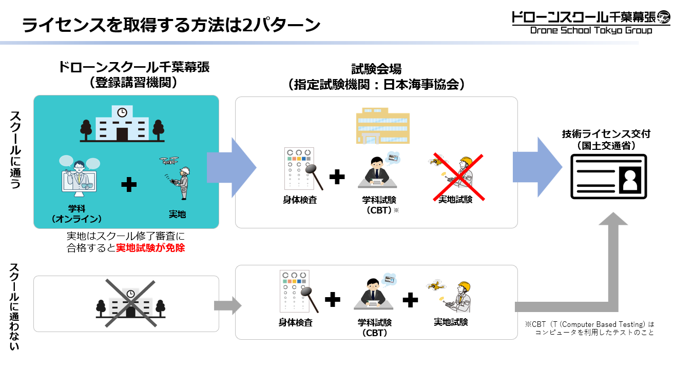 1つ目は、国土交通省の登録講習機関(ドローンスクール)で、学科と実地の講習を受け、実地修了試験に合格し、指定試験機関にて身体検査と学科試験に合格する方法です。