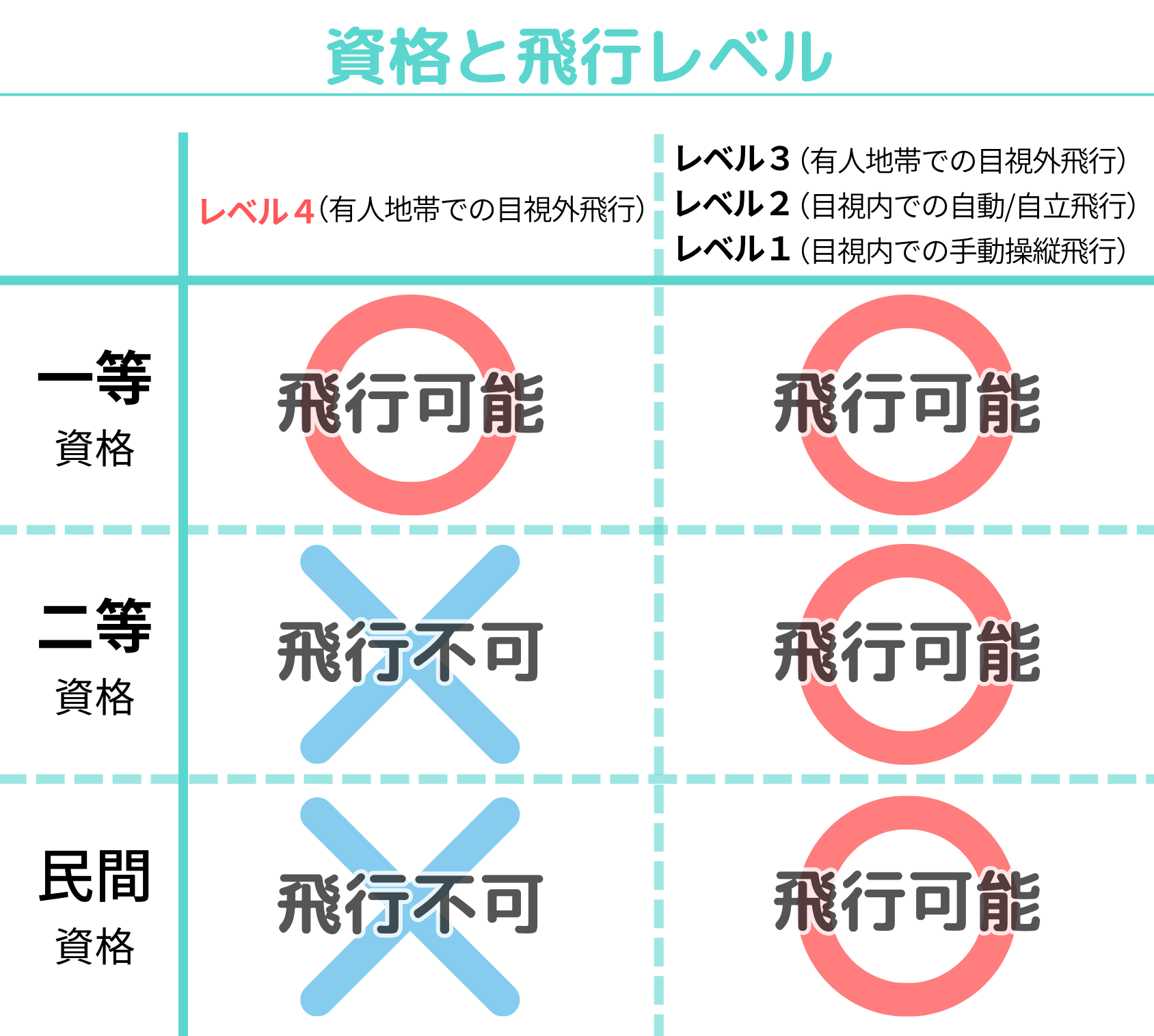 現在ドローンの飛行形態につては、4つのレベル分けがなされており、今回講習が開始される一等資格ではレベル4飛行(有人地帯での目視外飛行)が行えるようになります。