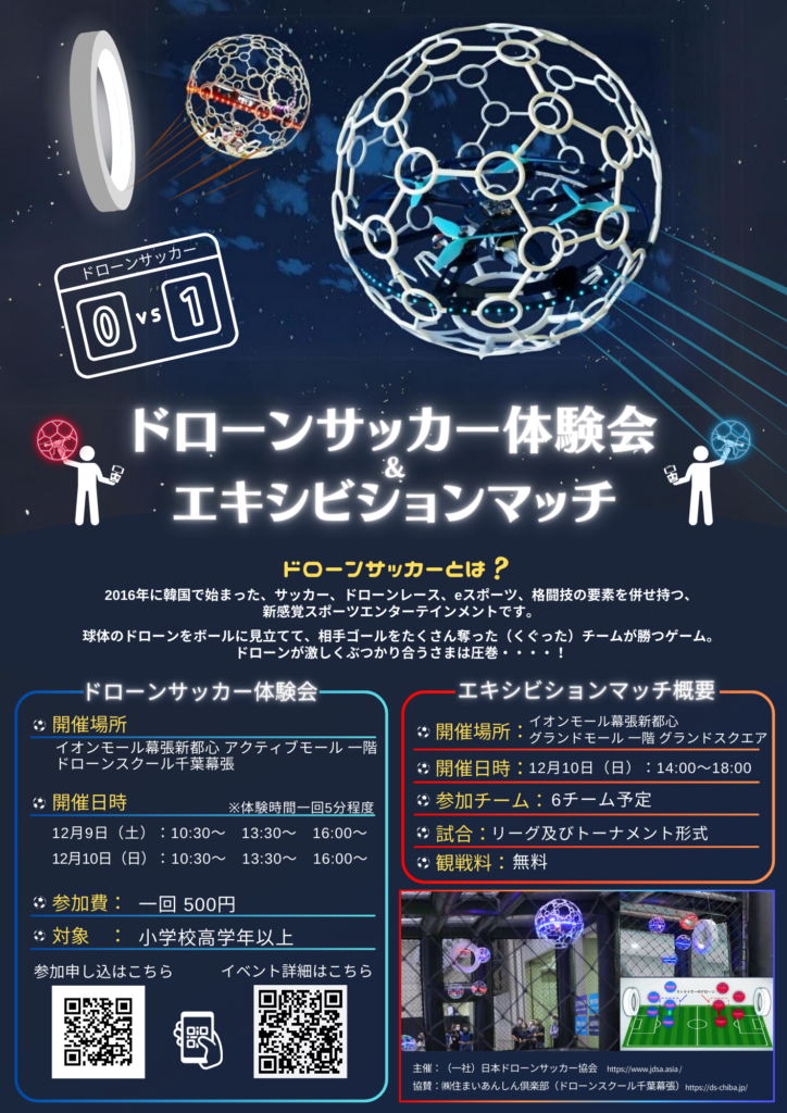 そしてドローンスクール千葉幕張では、一般社団法人 日本ドローンサッカー協会と協力して2023年12月9日と10日にドローンサッカーイベントにて操縦体験会を開催することとなりました。