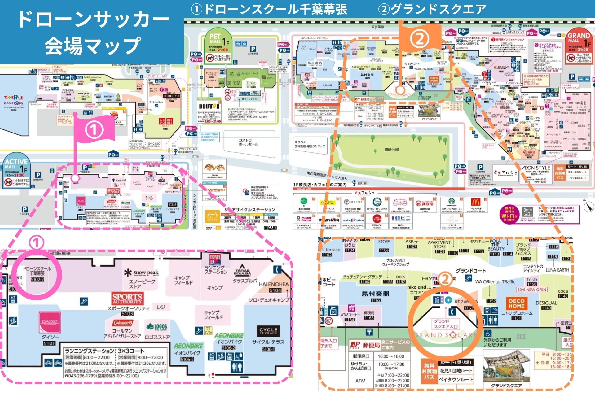 一つ目の会場は、アクティブモールの一階にあるドローンスクール千葉幕張の屋内コート(①)で、2つ目の会場がグランドモールにあるグランドスクエア(②)という屋外イベントスペースで開催されます。