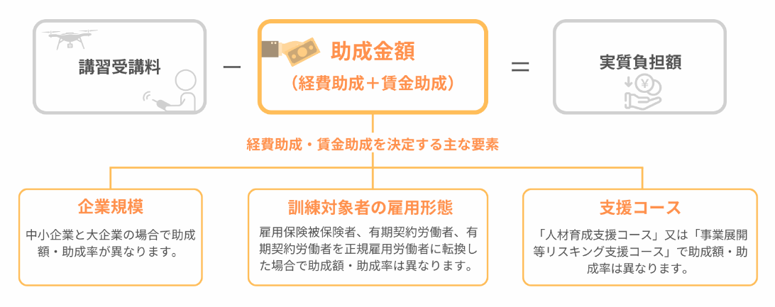 「賃金助成」と「経費助成」の2つの合計額が助成金として支給されます。 「賃金助成」と「経費助成」は企業規模や訓練対象者の雇用形態、「賃金要件」・「支援コース」によって決定されます。