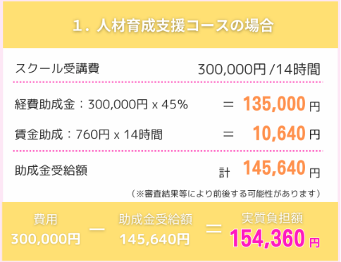 人材開発支援助成金とは、事業主が雇用する労働者に対して、業務に必要な専門知識やスキルを習得を計画に沿って行う場合等に、厚生労働省が訓練にかかる費用や、労働者が訓練を受けている間の賃金の一部を助成してくれる制度です。 当スクールでの講習費用も最大75%が助成されるため、法人企業の皆様には積極的な活用をオススメします。 さらに令和5年度からは、受給対象となる労働者の範囲が拡大され、新たに「リスキリング支援コース」が加わり、支援がより手厚くなりました。 この制度は中小企業だけでなく大企業も活用できます。 ※中小企業と大企業では助成額・助成率が異なります。 詳細については、厚生労働省ホームページをご参照ください。 https://www.mhlw.go.jp/stf/seisakunitsuite/bunya/koyou_roudou/koyou/kyufukin/d01-1.html