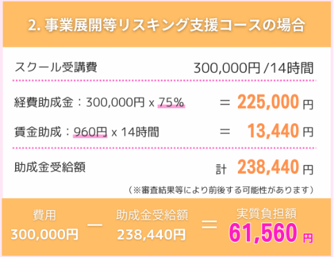新しい事業や技術の導入に伴い、従業員に必要な知識やスキルを身につけてもらうための訓練を行う企業に対して、その費用や訓練中の賃金の一部を助成する令和4年度から8年度までの期間限定の助成金です。 このコースは、講習に伴い発生する費用の最大75%が助成される点と、訓練中の賃金が1時間あたり960円も助成されることが特徴です。 また人材育成支援コースでは補助の受けられない、学科・身体検査の受験費用や資格証明書発行費用もリスキング支援コースでは補助の対象となるため、よりお得に資格を取得することができます 以下3つの内のどれかに伴う内容であれば助成金の対象となります。