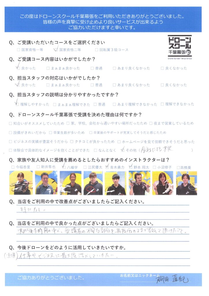 柳田直紀様国家資格二等コース